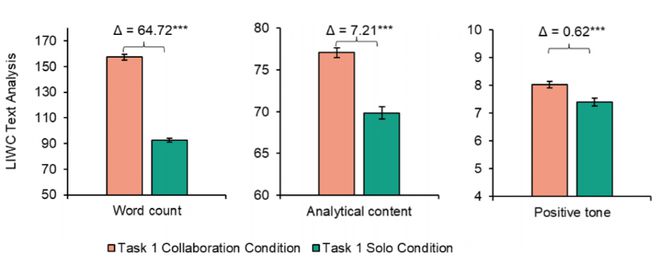 在涉及各种认知要求较高的任务(如文本生成和创意头脑风暴)的四项研究中,该研究团队的结果一致表明,人类与 GenAI 的协作具有双刃剑效应。