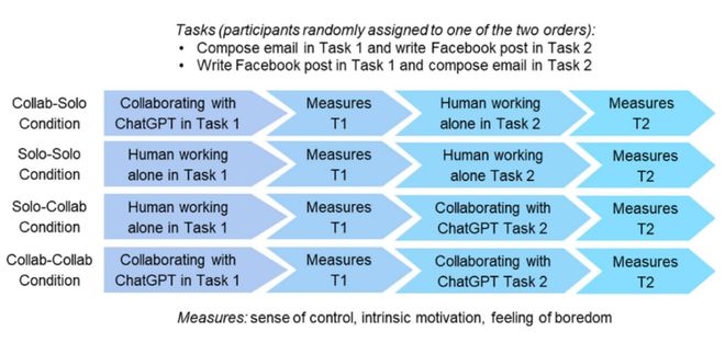 在793人参与的研究 3中,受试者被要求扮演团队经理的角色,在有或没有 ChatGPT 的帮助下撰写一封电子邮件,向整个团队介绍一位新同事。然后要求受试者报告他们在任务 1 中的心理体验,包括控制感、内在动力和无聊感。接下来,参与者继续进行任务 2,要求他们自己为指定的清洁产品提出有创意的营销想法。之后,受试者再次报告他们在任务 2 中的心理体验。