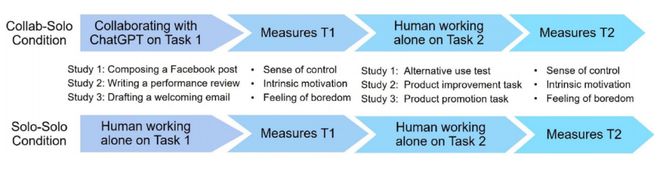在352人参与的研究 1中,参与者在 ChatGPT 的协助下或不在 ChatGPT 的协助下(分别为Collab-Solo 与 Solo-Solo)起草一篇 Facebook 宣传帖子。完成任务 1 后,受试者报告自己的心理体验(包括控制感、内在动力和无聊感),然后进入任务 2,即替代用途测试(AUT)。在替代用途测试中,受试者自己为苏打罐的创新用途进行头脑风暴。
