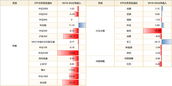 5月19日至22日,ETF整体流出超166亿元,其中宽基流出超128亿元,中证A500、创业板、沪深300等核心宽基为主要流出方向,科创板逆市净流入。行业主题方面,受地缘风险影响,军工大幅净流入,金融、科技净流入居前。受上涨驱动,医药板块部分资金获利了结。