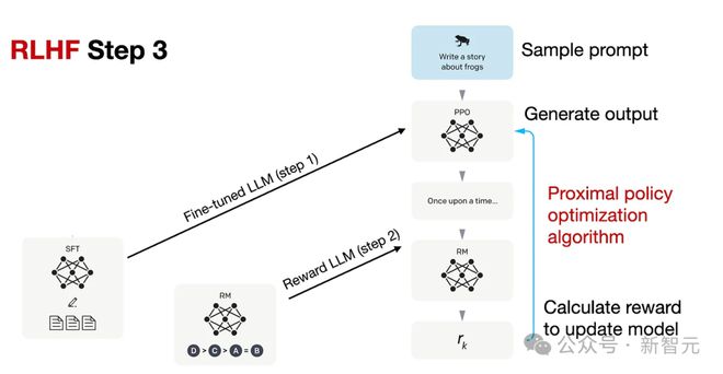 RLHF第三步(也是最后一步)使用在第二步中训练好的奖励模型,为模型生成的回答打分,然后基于这些评分,使用近端策略优化(PPO)等算法对SFT模型进行强化学习微调。