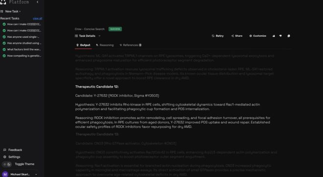 在综合了400多篇科学论文和临床实验报告后,该系统生成了增强RPE吞噬作用的治疗候选药物的假设。