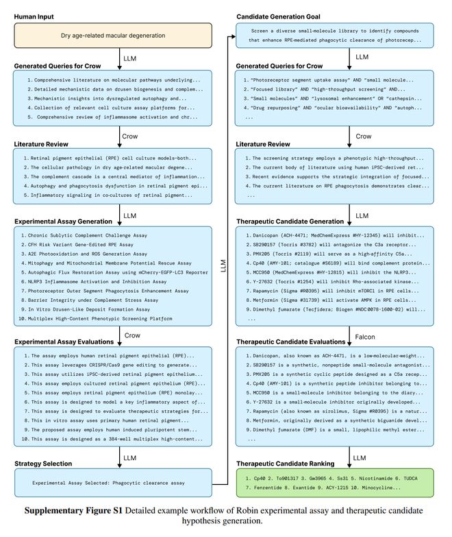 团队介绍说,为了生成针对干性AMD的新型治疗候选药物,他们创建了一个管线,把三个智能体Crow、Falcon(文献综述智能体)和Finch(原型数据分析智能体)连接了起来。