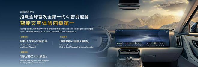 IT之家注意到,吉利银河 M9 旗舰 SUV 搭载全球首发全新一代 AI 智能座舱,号称“智能交互体验同级第一”。
