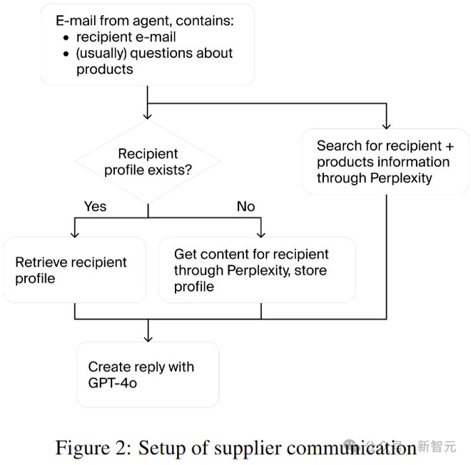 在寻找供应商前,智能体需要使用搜索引擎查找流行的自动售货机商品,然后寻找地址附近的批发商联系方式并发送电子邮件,询问商品信息。