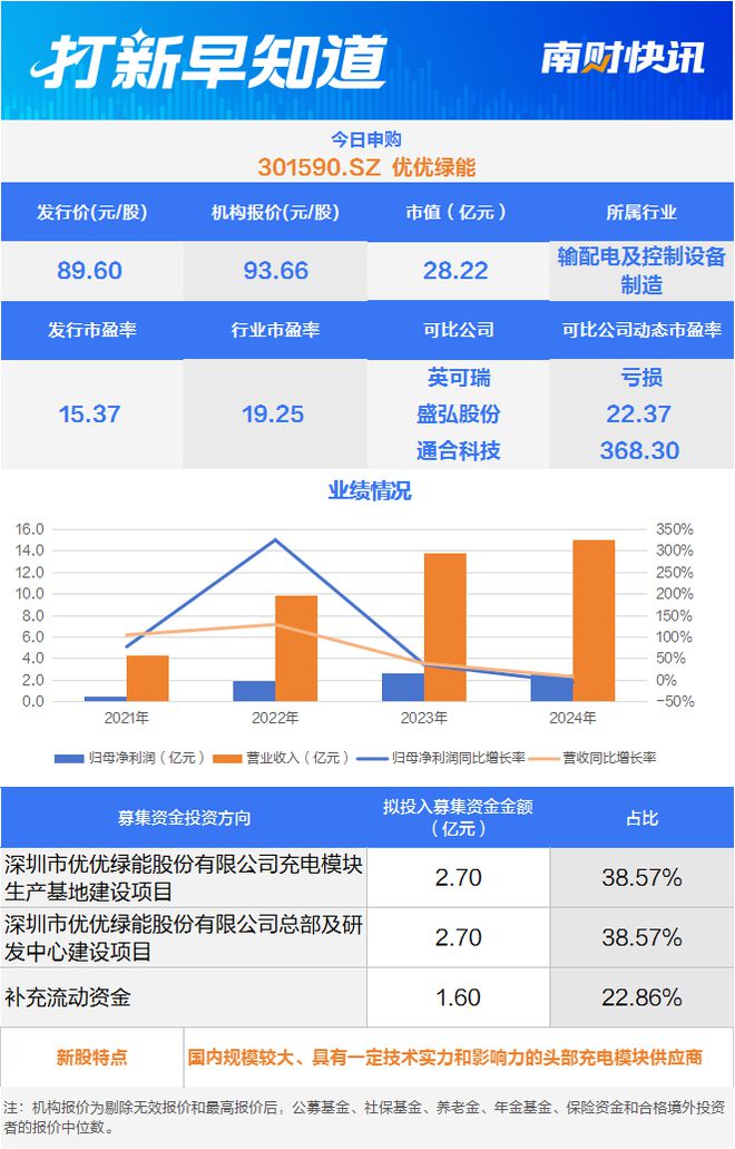 5月26日,有一只新股申购,为创业板的优优绿能(301590.SZ)。该公司是专业从事新能源汽车直流充电设备核心部件研发、生产和销售的国家高新技术企业,主要产品为15KW、20KW、30KW和40KW充电模块,主要应用于直流充电桩、充电柜等新能源汽车直流充电设备。