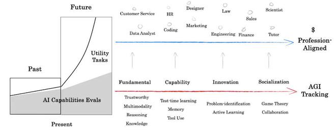 该体系创新性地将评测任务分为两条互补的主线:(1)评估AI系统的能力上限与技术边界;(2)量化AI系统在真实场景的效用价值(Utility Value)。其中,后者需要动态对齐现实世界的应用需求,基于实际工作流程和具体社会角色,为各垂直领域构建具有明确业务价值的测评标准。