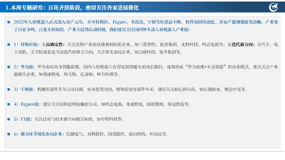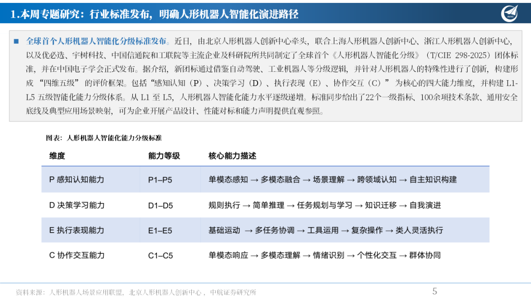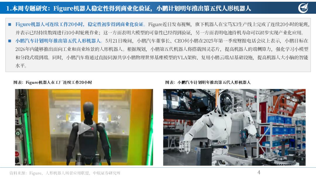 近日人形机器人产业动态汇总:1)特斯拉更新Optimus视频,Optimus仅依靠单一神经网络可以完成各种复杂家务场景和工厂制造场景;2)Figure近日发布视频,旗下机器人在宝马X3生产线上完成了连续20小时的轮班,并表示已经持续数周进行10小时轮班作业;3)5月21日晚间,小鹏汽车董事长、CEO何小鹏在2025年第一季度财报电话会议上表示,小鹏目标在2026年内能够推出面向工业和商业场景的人形机器人;4)近日,由北京人形机器人创新中心牵头制定了全球首个《人形机器人智能化分级》,明确人形机器人智能化演进路径,为企业开展产品设计、性能对标和能力声明提供直观参照。产业大趋势启动时刻,我们建议关注国内外头部人形机器人产业链:1)T链:三花智控、拓普集团、北特科技、鸣志电器、浙江荣泰等;2)华为链:埃夫特、亿嘉和、柯力传感、兆威机电等;3)Figure链:鸣志电器、兆威机电、绿的谐波、领益智造等;4)1X:中坚科技等;5)细分环节领先企业:信捷电气、汉威科技、双林股份等。