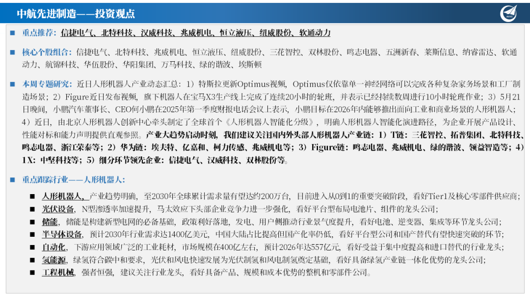 人形机器人:产业趋势明确,至2030年全球累计需求量有望达约200万台,目前进入从0到1的重要突破阶段,看好Tier1及核心零部件供应商。光伏设备:N型渗透率加速提升,马太效应下头部企业竞争力进一步强化,看好平台型布局电池片、组件的龙头公司。储能:储能是构建新型电网的必备基础,政策利好落地,发电、用户侧推动行业景气度提升,看好电池、逆变器、集成等环节龙头公司。半导体设备:预计2030年行业需求达1400亿美元,中国大陆占比提高但国产化率仍低,看好平台型公司和国产替代有望快速突破的环节。自动化:下游应用领域广泛的工业耗材,市场规模在400亿左右,预计2026年达557亿元,看好受益于集中度提高和进口替代的行业龙头。氢能源:绿氢符合碳中和要求,光伏和风电快速发展为光伏制氢和风电制氢奠定基础,看好具备绿氢产业链一体化优势的龙头公司。工程机械:强者恒强,建议关注行业龙头,看好具备产品、规模和成本优势的整机和零部件公司。