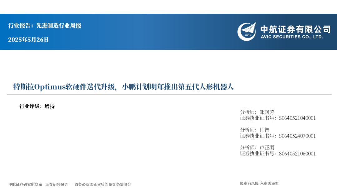 证券研究报告名称:特斯拉Optimus软硬件迭代升级,小鹏计划明年推出第五代人形机器人