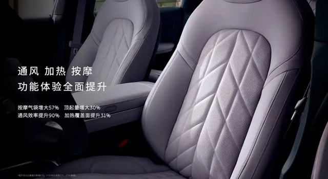而前面说到的座椅升级,经过面料和填充的优化之后,最终坐垫柔软性提升了20%,后排坐垫的有效支撑长度增加了75mm,脚步空间提高了27%;对于具体的功能,按摩气袋增大了57%,通风效率提升了90%,加热覆盖面积提升了31%。