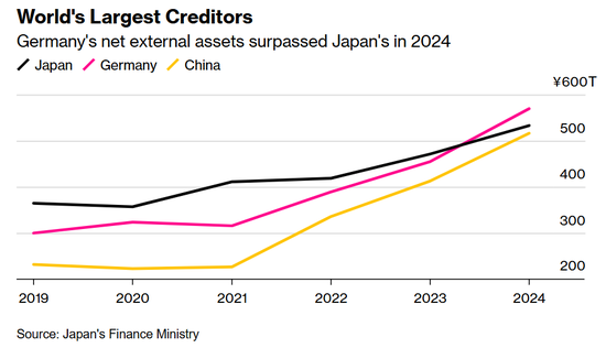 日本财务省周二公布的数据显示,尽管日本2024年末的对外净资产达到创纪录的533.05万亿日元(约合3.7万亿美元),同比增长约13%,但仍被德国超越。德国的对外净资产总额为569.7万亿日元,而中国仍以516.3万亿日元位居第三。