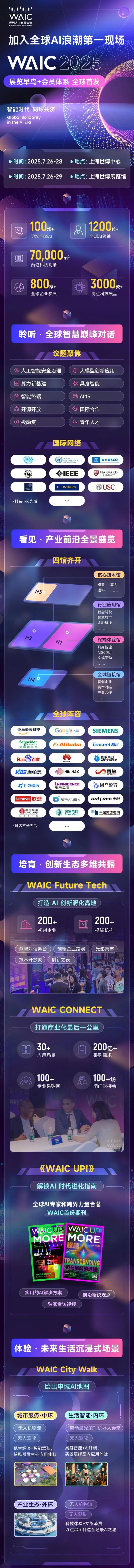 同时,全球超过1200位AI领袖将在此参加超过100场论坛问道AI,议题聚焦于人工智能安全治理、大模型创新应用、算力新基建、具身智能、智能终端、AI4S、开源开放、国际合作、投融资、青年人才等方面。