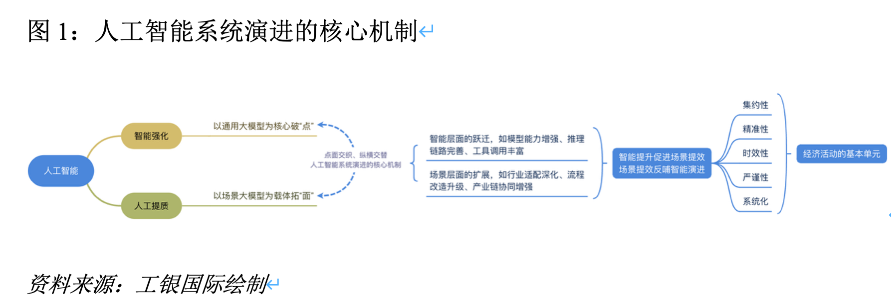 人工智能的系统演进,不是单向的“点”升级或“面”铺展,而是点面结合、纵横交替的过程。“纵”的深化是指智能层面的提升,如模型能力增强、推理链路完善、工具调用丰富,“横”的铺展是指场景层面的扩展,如行业适配深化、流程改造升级、产业链协同增强。这种“纵横交替”的机制,本质上是智能提升促进场景提效,而场景提效又反哺智能演进。“点”的突破提供了更强的触角,“面”的扩容又提供了更大的舞台,“点”与“面”的相互作用使得AI与实体经济系统之间的“接触面积”显著提升,从而推动全要素生产率的立体跃迁。