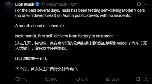 马斯克表示,该计划将比原计划提前一个月实施,预计在6月实现首次从工厂到客户的自主交付。