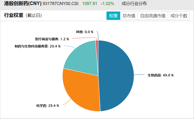 中证香港创新药指数:根据中证三级行业划分,生物药品占比49%、化学药占比29.4%、制药与生物科技服务占比20.4%、医疗商业与服务占比1.2%,相对来说更为均衡一些。