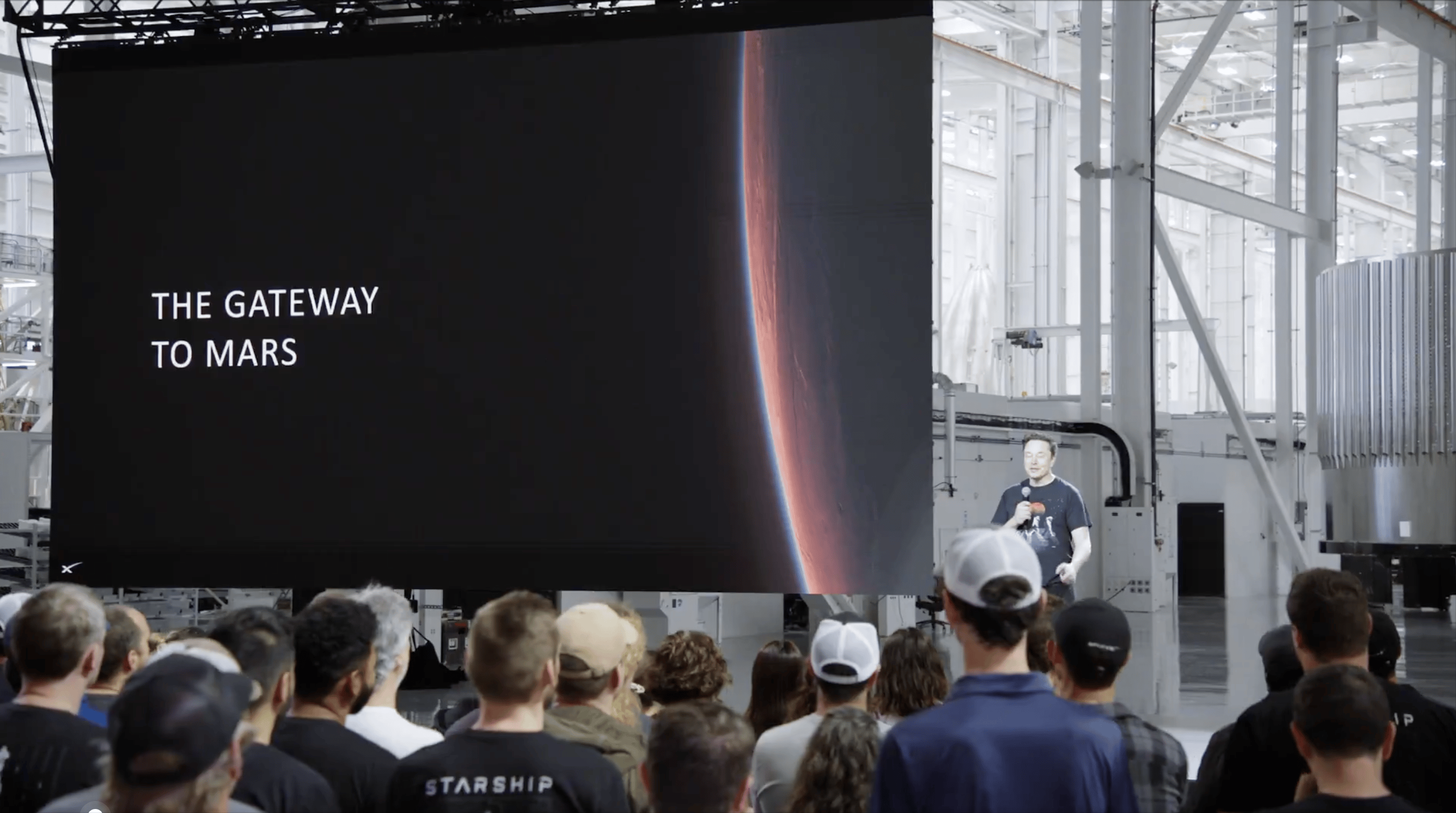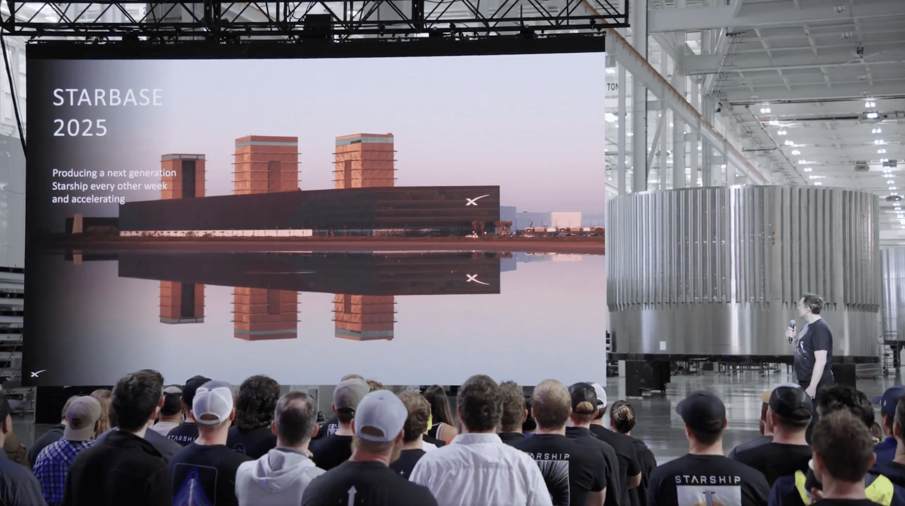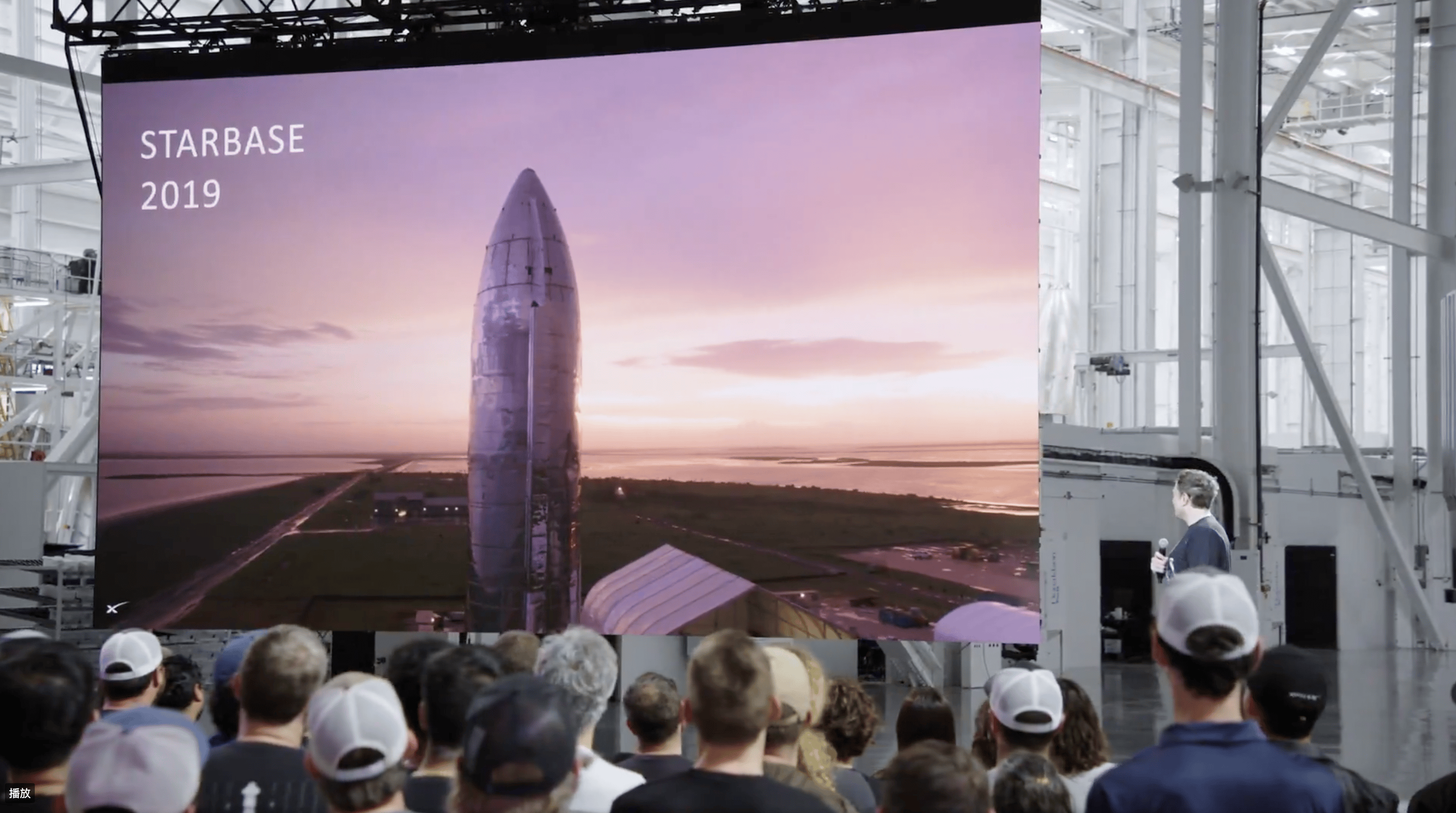 好,让我们开始今天的演讲,前往火星的大门已经开启。我们现在来到了新成立的「星舰基地」(Star Base)德克萨斯。
