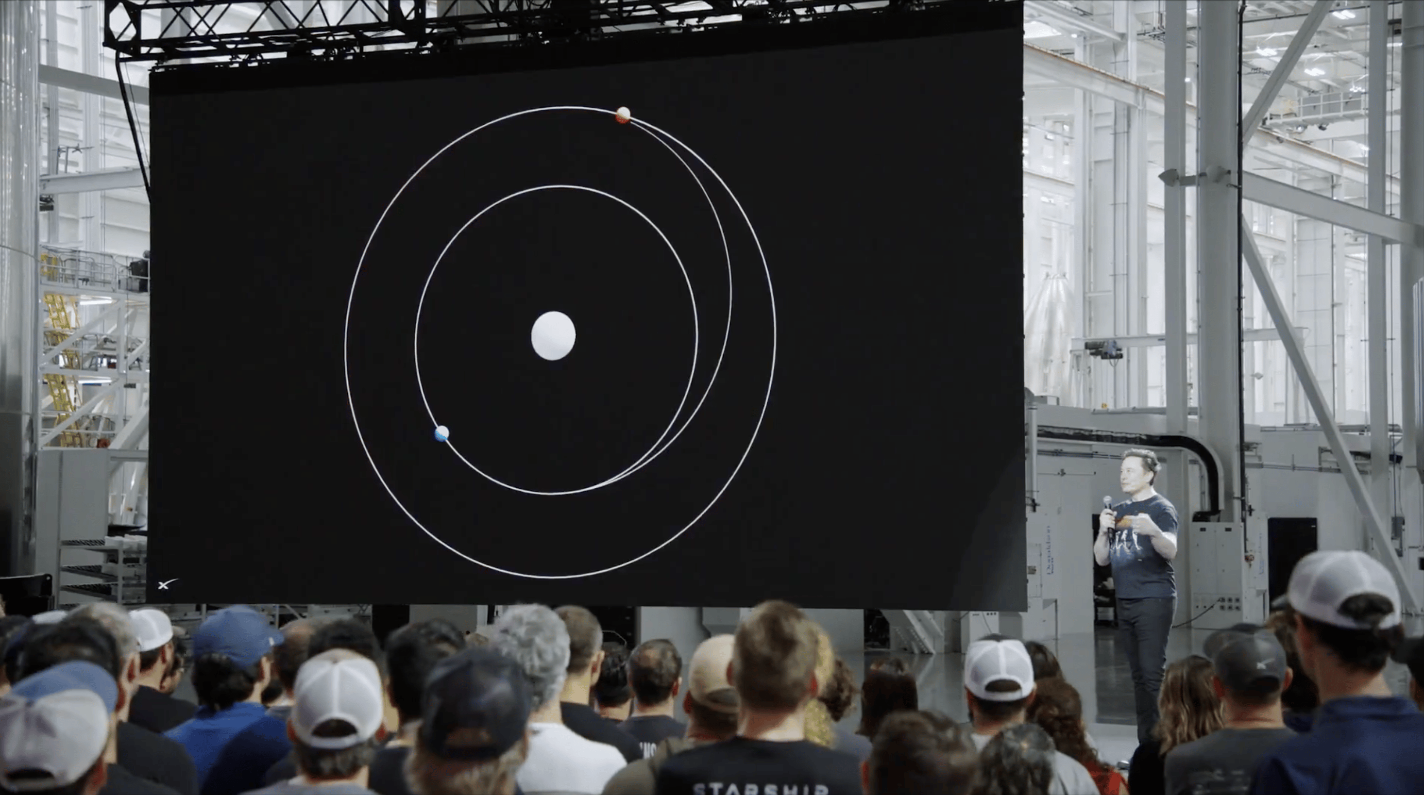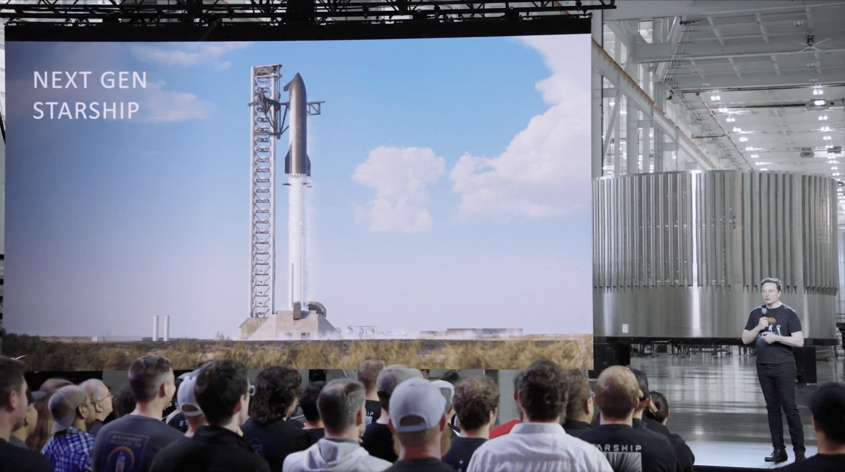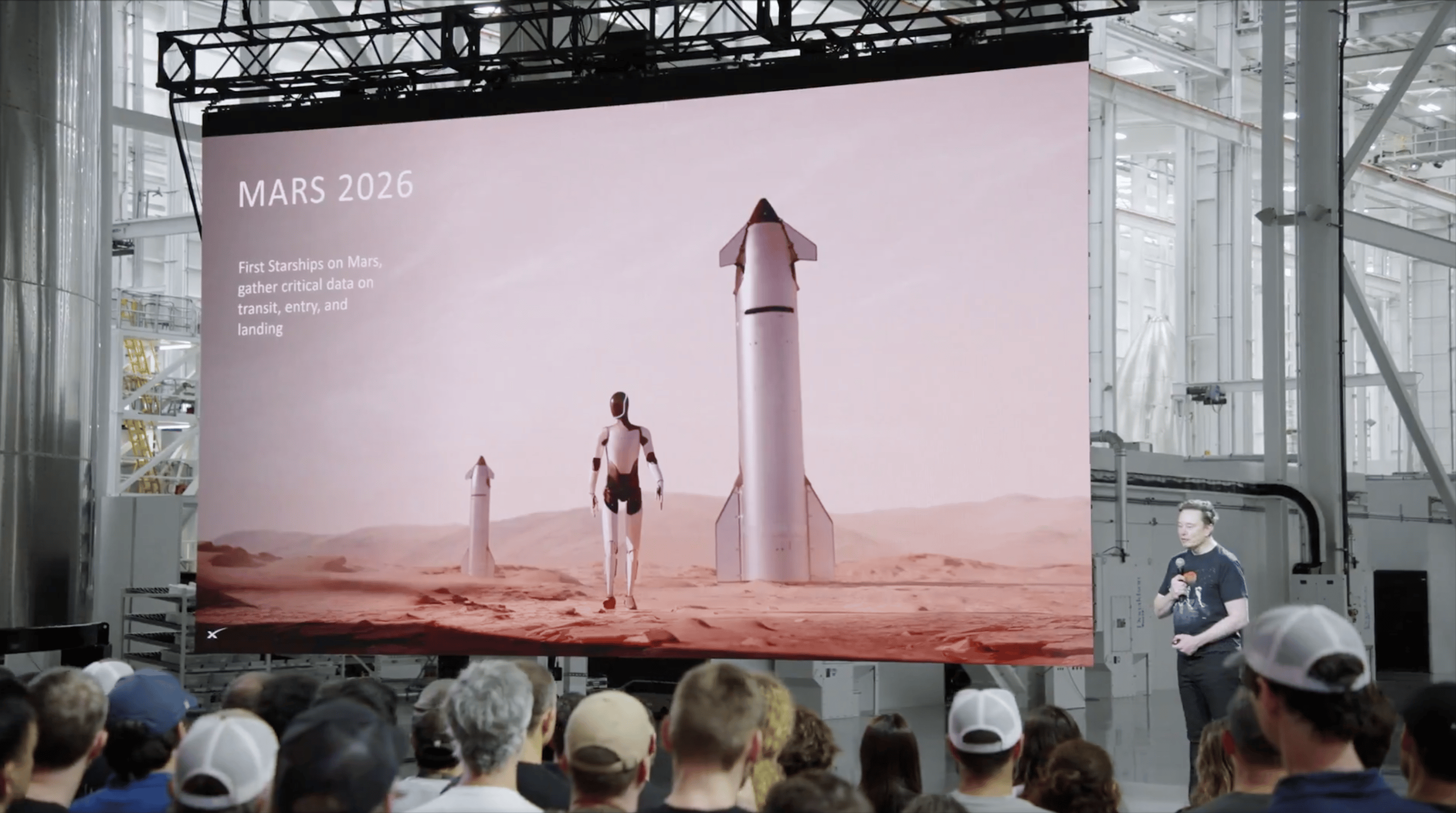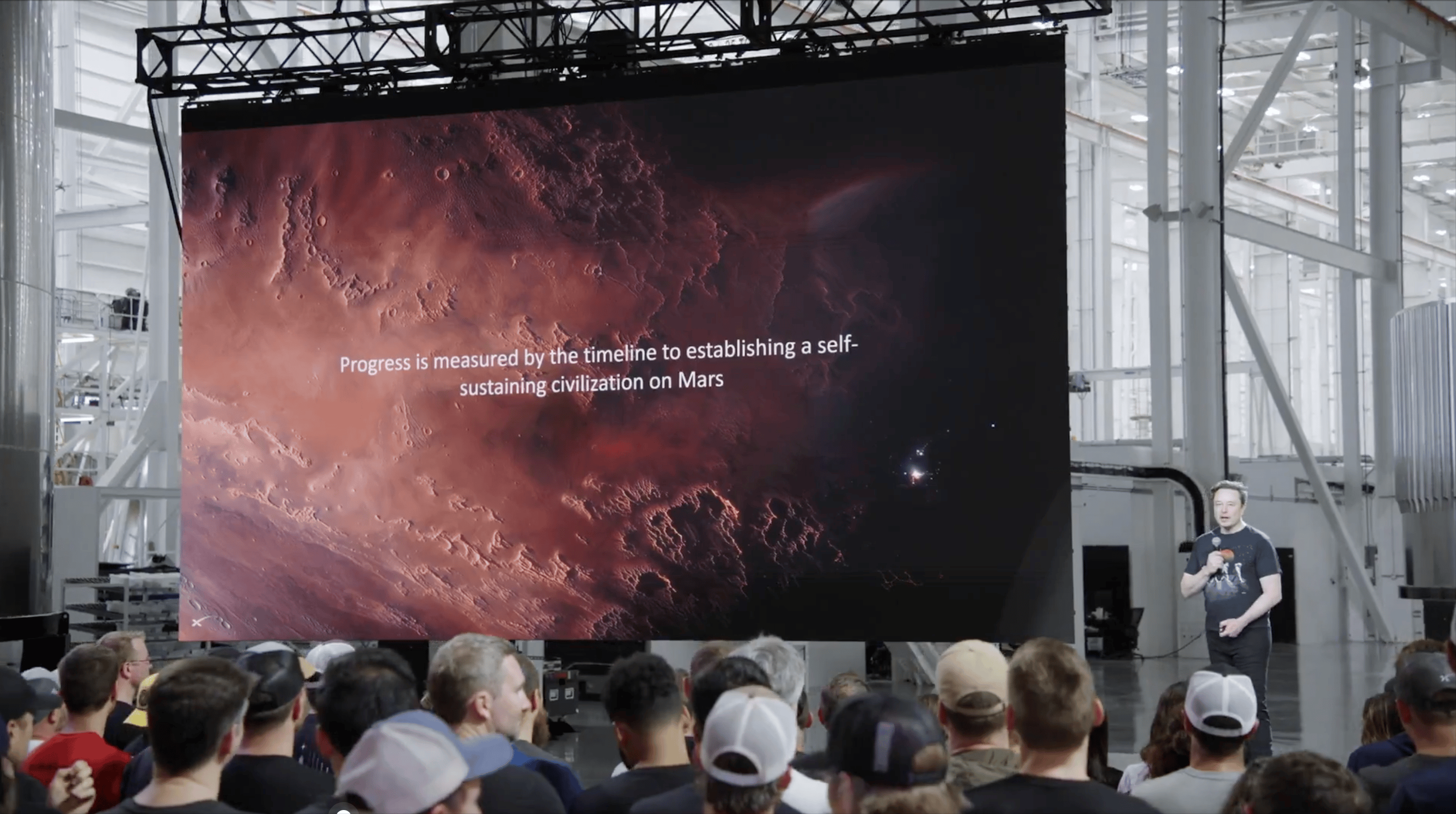 好,让我们开始今天的演讲,前往火星的大门已经开启。我们现在来到了新成立的「星舰基地」(Star Base)德克萨斯。