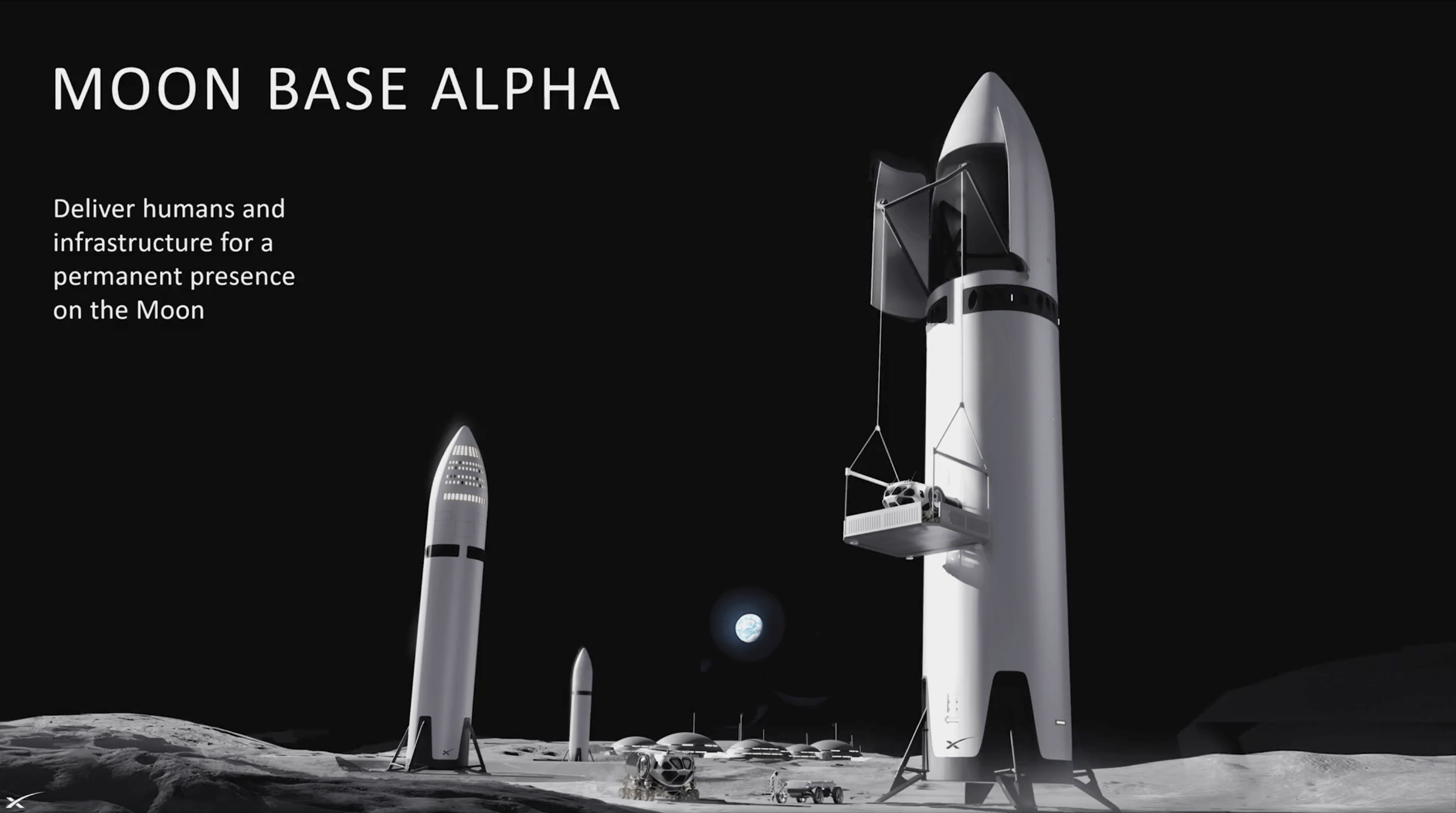 所以我要说的是:这是一枚非常庞大的火箭。但想要实现「人类多星球生存」,我们就必须拥有这样的大火箭。而在实现火星移民的过程中,我们还可以做很多很酷的事情,比如在月球建立一个基地——月球基地阿尔法。