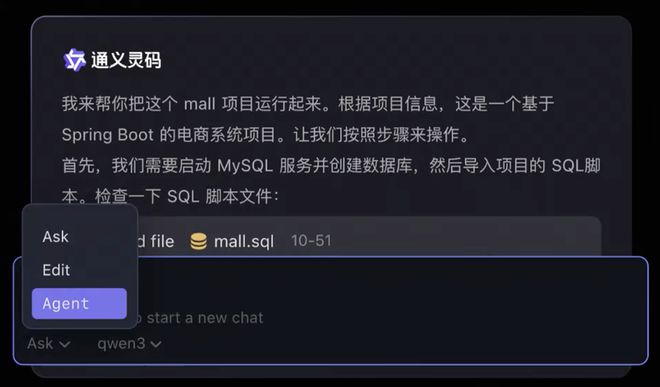 通义灵码AI IDE针对不同技术栈、不同开发复杂度,在一次会话流中同时支持三种会话模式:问答模式(Ask)、文件编辑模式(Edit)、智能体模式(Agent)。