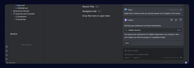 通义灵码AI IDE支持基于大模型的自主记忆能力,在开发者与通义灵码的对话过程中,通义灵码会逐步形成针对开发者个人、工程、问题等相关的丰富记忆,并自动进行相关的记忆整理和更新。