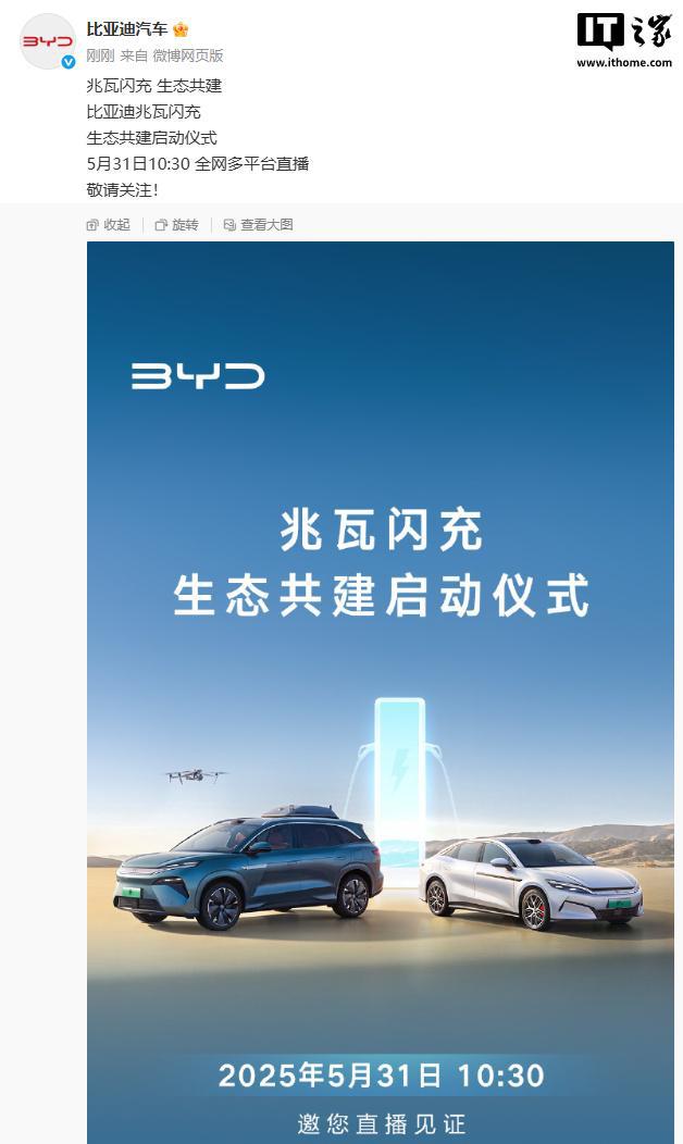 IT之家 5 月 30 日消息,比亚迪今日宣布,兆瓦闪充生态共建启动仪式将于 5 月 31 日 10:30 全网多平台直播。