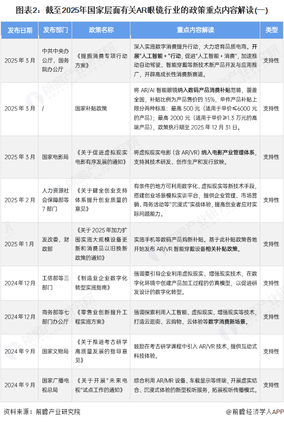 近年来,国家先后出台了《关于促进电子产品消费的若干措施》、《关于打造消费新场景培育消费新增长点的措施》等政策,鼓励促进虚拟现实(VR)体验等文娱业态场景创新,将AR/AI智能眼镜纳入数码产品消费补贴范畴,鼓励利用AR/VR技术应用于银发经济、数字教育等行业领域,详细政策内容参考如下: