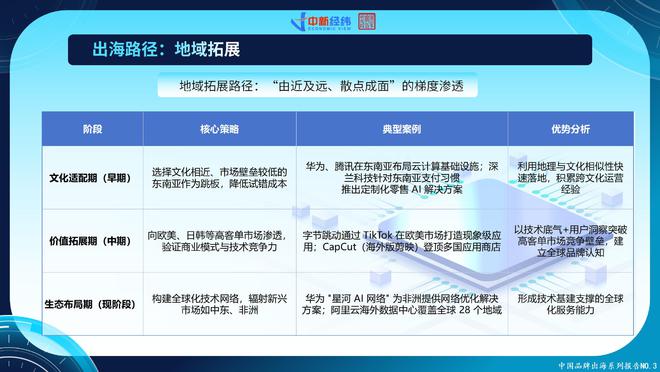 在地域拓展路径方面,《报告》指出,AI出海呈现“由近及远、散点成面”的梯度渗透特征。文化适配期(早期)阶段主要是利用地理与文化相似性快速落地,积累跨文化运营经验,一般会选择文化相近、市场壁垒较低的东南亚作为跳板,降低试错成本;价值拓展期(中期)则以技术底气+用户洞察突破高客单市场竞争壁垒,建立全球品牌认知,向欧美、日韩等高客单市场渗透,以验证商业模式与技术竞争力;至生态布局期(现阶段),企业已形成技术基建支撑的全球化服务能力,构建全球化技术网络,辐射新兴市场如中东、非洲。
