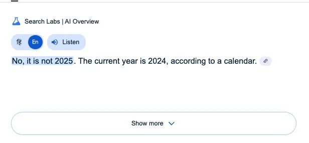 过去几天,不少用户发现,当他们向谷歌询问现在是哪一年时,AI 概览的回答竟然是“2024 年”。