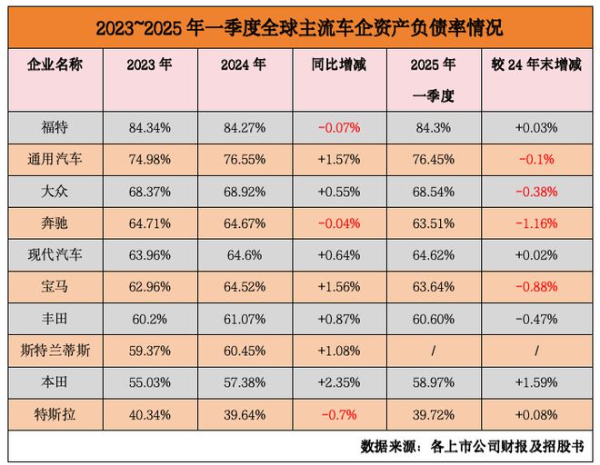 汽车产业素有“吞金兽”之称,其“高投入、长周期、重资产”的特性决定了融资杠杆的普遍存在。然而,当前全球汽车产业的债务图景呈现鲜明的“冰火两重天”格局。2023-2025年,通用汽车、大众汽车、现代汽车、丰田汽车等国际头部车企的资产负债率持续走高,负债率皆在60%以上。其中,福特汽车的负债率更是连续两年盘踞在84%高位。