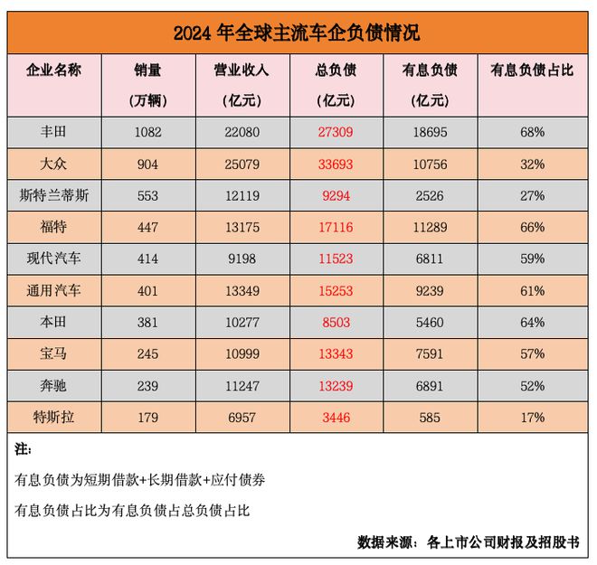相较于单纯的负债率指标,有息负债占比更能精准衡量车企的财务杠杆风险。2024年末数据显示,丰田有息负债高达1.87万亿元,占总负债的比例达68%;福特紧随其后,1.13万亿元的有息负债占比66%;就连相对保守的大众,也有1.1万亿元有息负债,占总负债的32%。此外,通用汽车、奔驰、宝马等全球头部车企的有息负债均以千亿计。