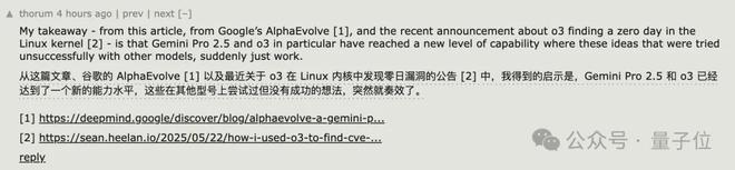 这一发现再加上之前DeepMind的AplhaEvolve,以及o3发现Linux的0day漏洞等一系列事件,让网友们认为Gemini 2.5Pro和o3的能力水平已经达到了新的层级。