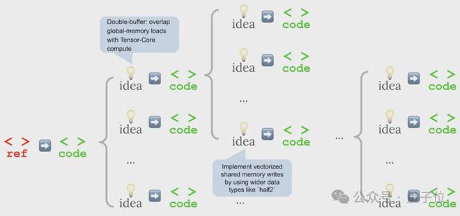 具体来说,他们的方法并非每一步都只优化一个候选方案,而是将每个想法分散开来,使其衍生出多个实现,并使用性能最高的内核作为下一轮的种子。
