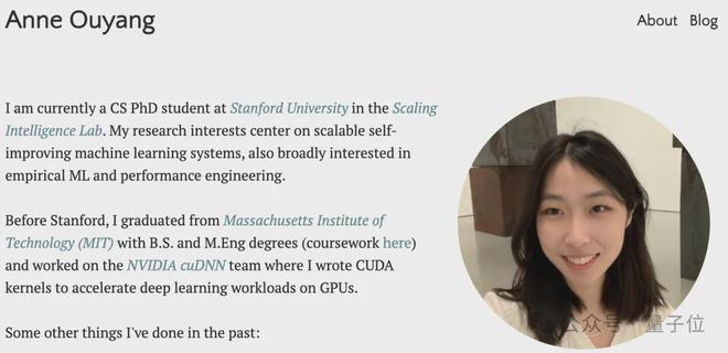 Ouyang目前是斯坦福大学扩展智能实验室的博士生,她本硕毕业于麻省理工,曾在英伟达cuDNN团队工作。