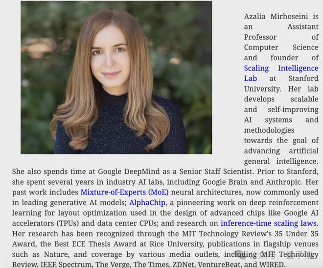 Azalia Mirhoseini是斯坦福大学计算机科学助理教授、斯坦福扩展实验室创始人。她曾在DeepMind、Google Brain以及Anthropic工作过。