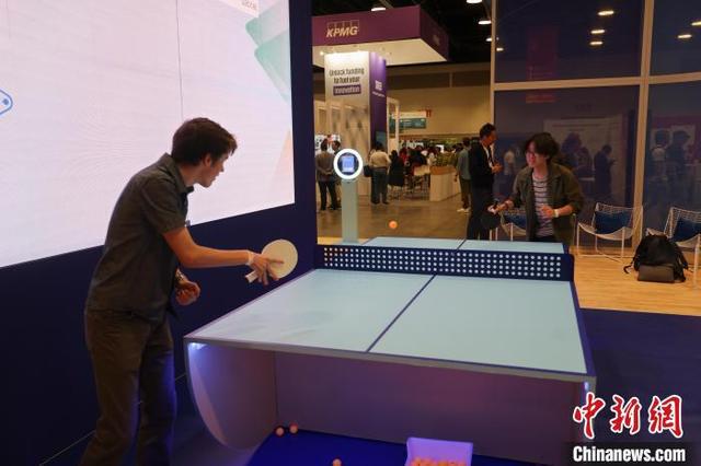 当地时间5月28日,在首届温哥华网络峰会(Web Summit)会场内,两名参会者通过打乒乓球体验AI(人工智能)自动计分和技术分析系统。中新社记者 余瑞冬 摄