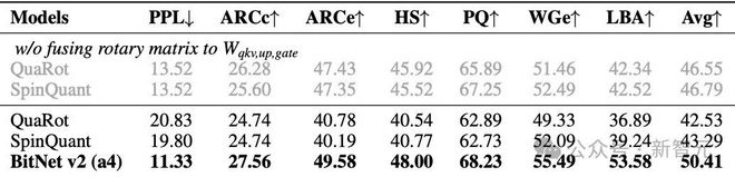 表4:BitNet v2、QuaRot和SpinQuant在各项下游任务上的困惑度(Perplexity)与零样本准确率(Zero-shot Accuracy)对比