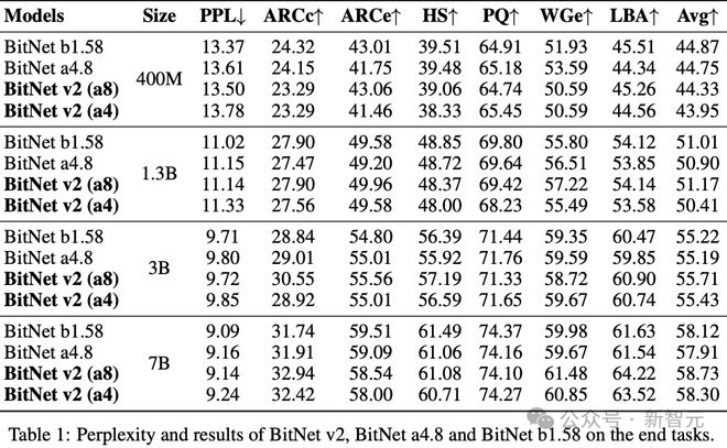 BitNet v2及其基线模型的详细实验结果,如表1所示。