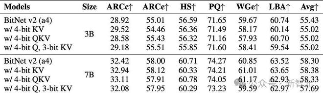 表3:BitNet v2在终端任务上的零样本准确率,其中激活使用4位,而QKV状态的位宽则有所不同。