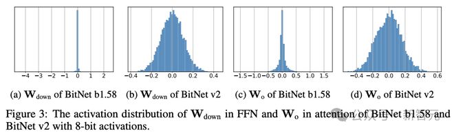 图3:采用8比特激活值时,BitNet b1.58与BitNet v2在前馈网络Wdown层和注意力机制Wo层的激活值分布对比。