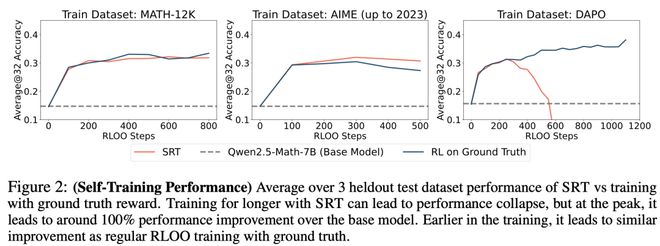 如下图2所示,在MATH和AIME训练集上,自监督SRT方法无需真实标记信号,即可取得与基于真实标记的强化学习相当的结果。
