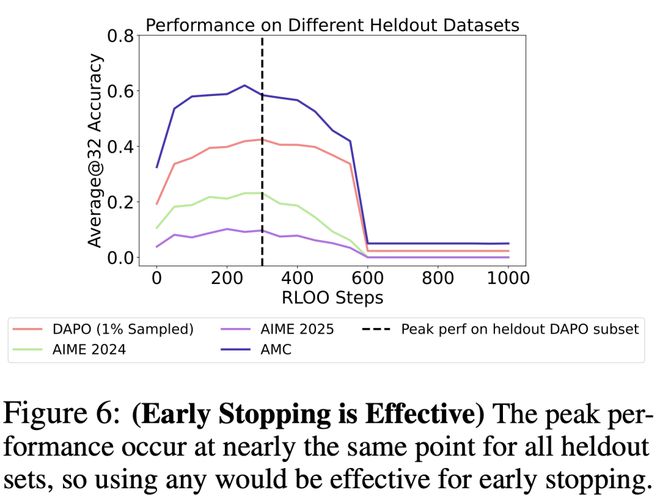 具体而言,图6中的垂直虚线展示了仅使用1%的DAPO数据作为验证集的早停效果——此时模型在所有其他评估数据集上的性能仍保持接近最优水平。