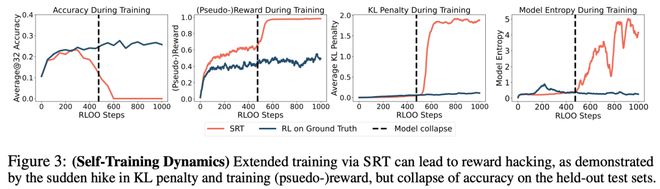 如上所述,自奖励训练(SRT)的优化目标,可能导致初期性能显著提升,但最终引发模型崩溃。