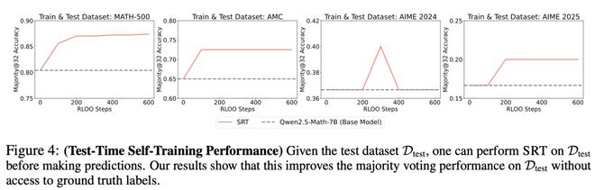 如下图4显示,在maj@32指标下,相比直接对基础模型生成输出应用主流多数投票基线,通过SRR实现的测试时训练能带来相对有限,但仍可察觉的性能提升。