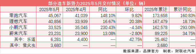零跑汽车5月全系交付创历史新高,达45067台,同比增长超148%,连续三个月稳居造车新势力领先地位。