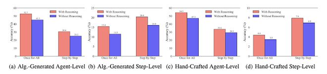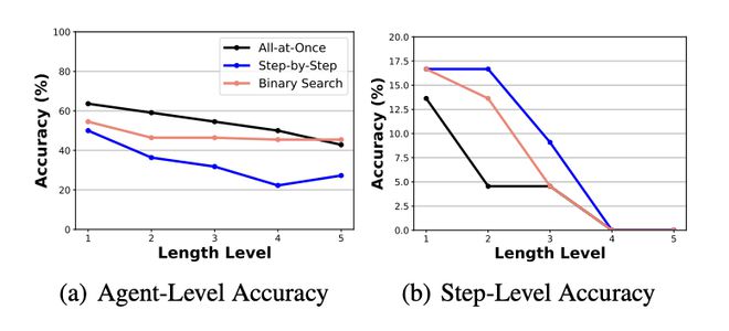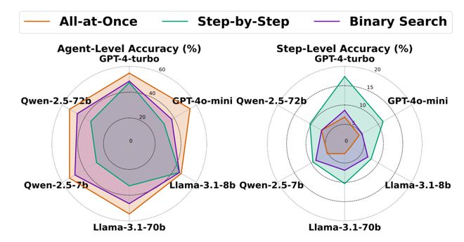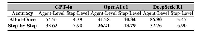 目前的方法离完美还差得很远。即便是表现最好的单一方法,在识别「背锅Agent」上的准确率也仅有约53.5%,而在准确定位「错误步骤」上,准确率更是低至14.2%!