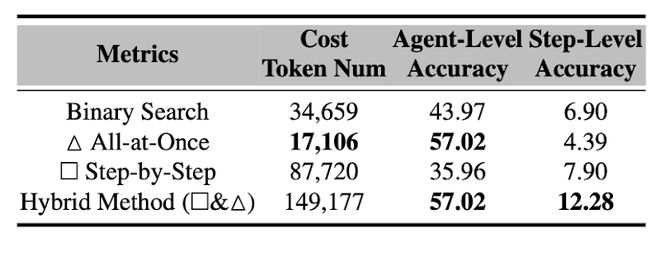 研究者尝试了组合不同方法的策略(例如,先使用「全局法」初步判断责任Agent,再运用「逐步法」精确定位错误步骤)。