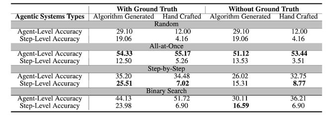 通过在Who&When数据集上对上述方法进行了系统评估,得到了许多重要的发现: