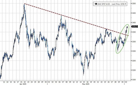 上周五回落0.85%的COMEX 8月黄金期货收涨2.47%,报3397.2美元/盎司。美股收盘后不久,现货黄金略低于3380美元,日内涨近2.8%。