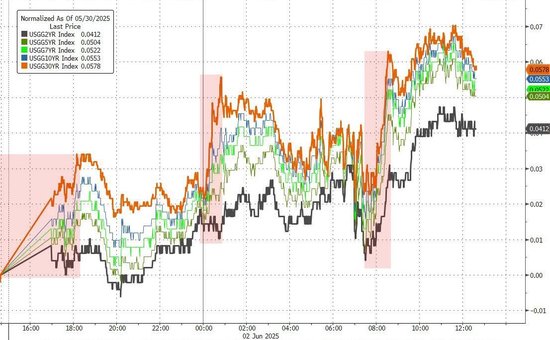 美制造业指数后,三大美股指刷新日低,美债收益率有所回落,美元指数近六周新低。领导人可能交谈消息后,美股指和中概指数转涨、6月惊险开门红,美债收益率反弹。Meta收涨3.6%,特斯拉跌超1%。钢铁税当前,钢铁股Cleveland-Cliffs涨23%、福特和通用汽车跌近4%、Stellantis欧股跌近5%、纽铜一度涨近6%。